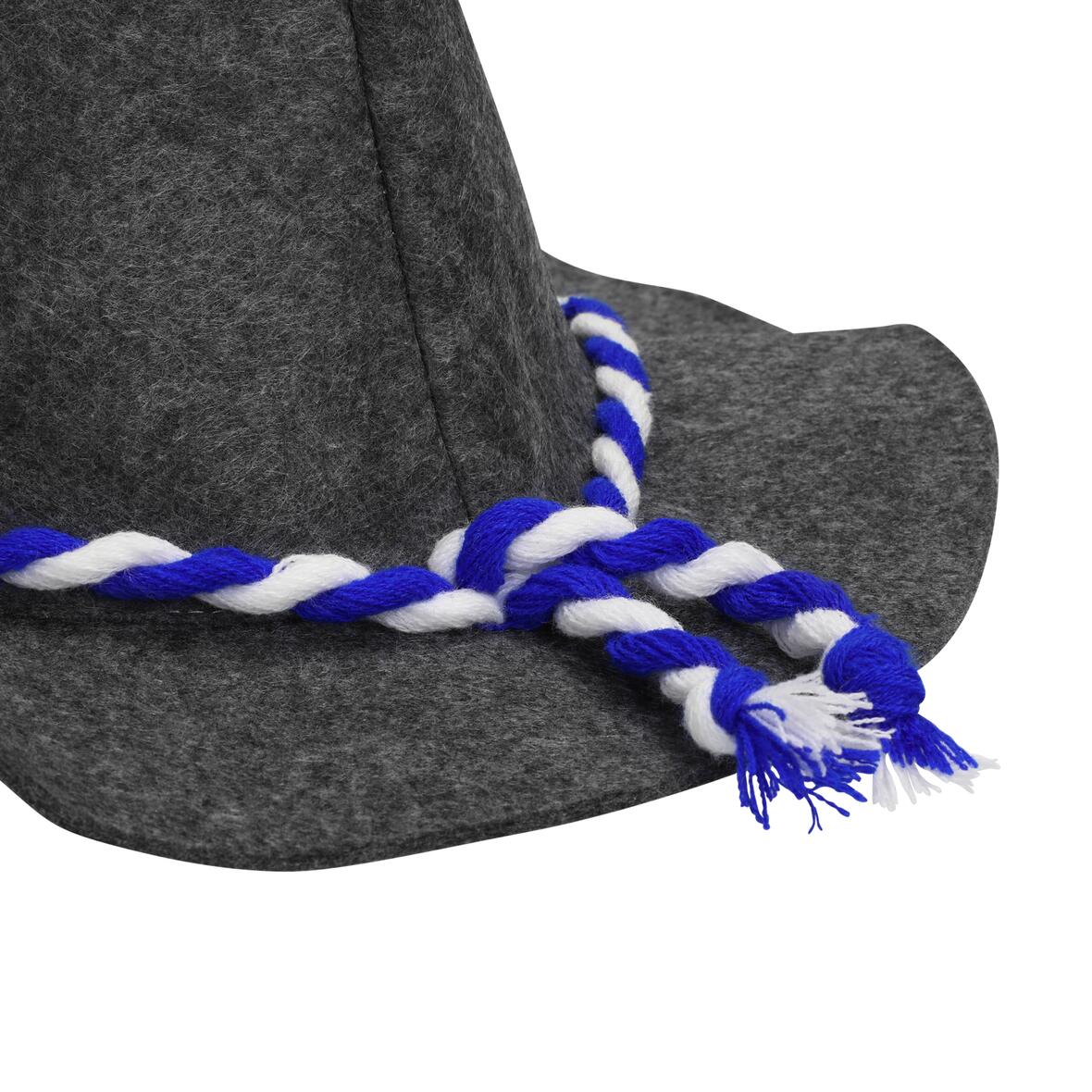 Robustní a chytrý plstěný klobouk se širokou krempou a vysokým vrcholem. Bavorský vzhled se zauzlovanou modrou a bílou nebo černou/červenou/žlutou šňůrou."