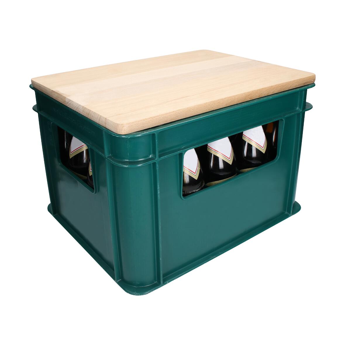 2 v 1. Robustní sedátko z bedny na pivo vyrobené z nenatřeného bukového dřeva evropského původu, které lze použít i jako sekací prkno. Vhodné pro všechny standardní bedny od piva. Na spodní straně jsou dvě tyče, které zaručují pevné držení bedny s pivem bez uklouznutí. Nevhodné pro čištění v myčce.