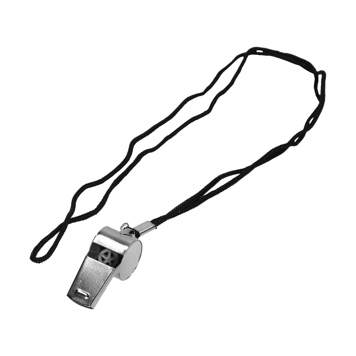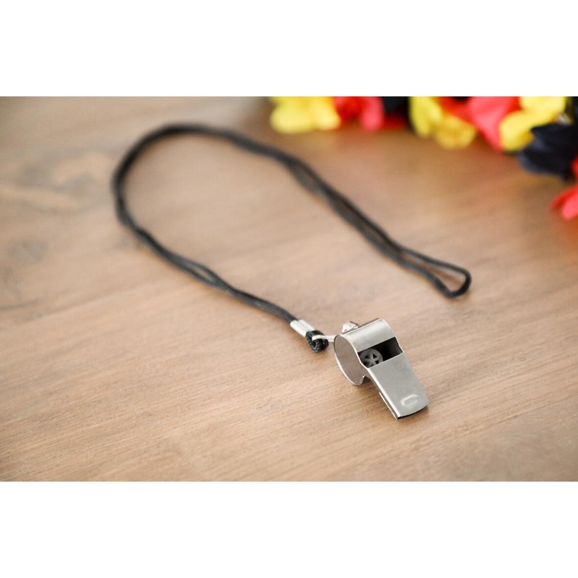 Kovová píšťalka s páskem pro zavěšení kolem krku.