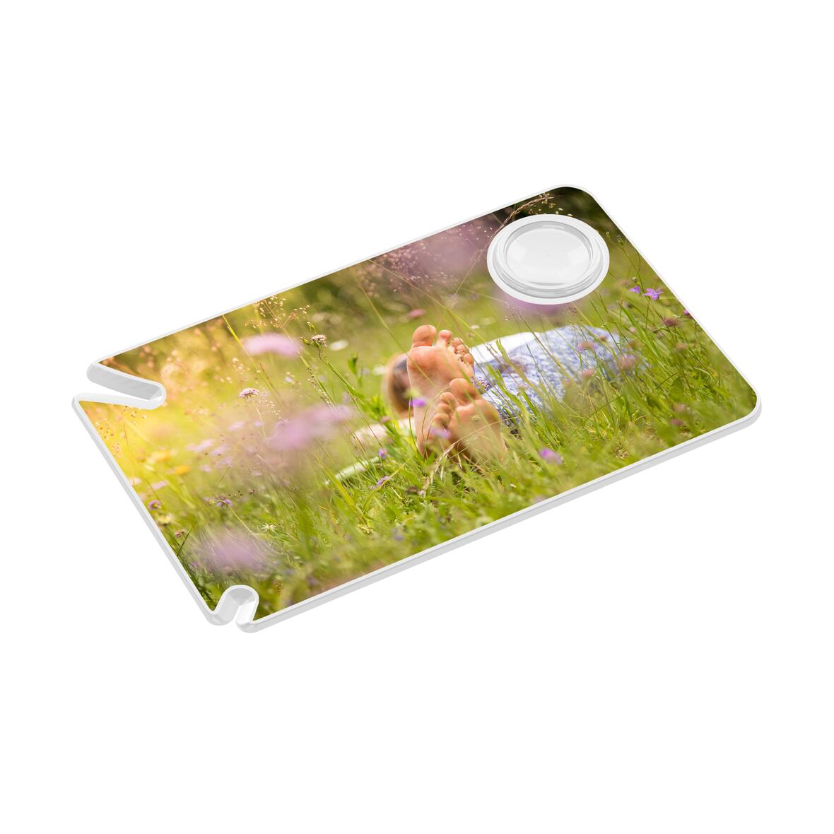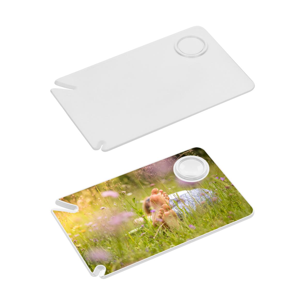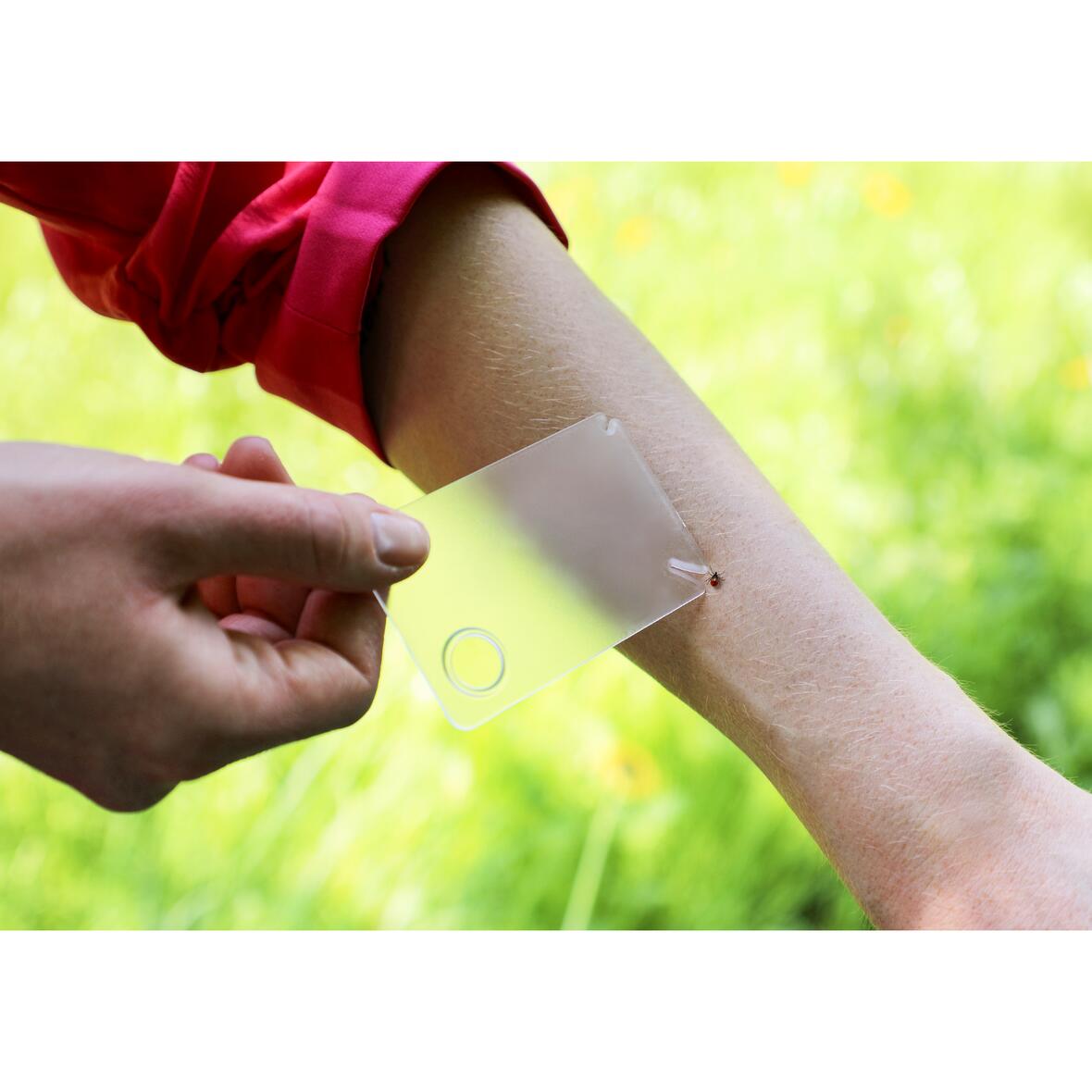 Praktická karta na odstraňování klíšťat pomocí dvou otvorů v rozích karty. Na kartě je lupa pro kontrolu správného odstranění klíštěte z kůže.